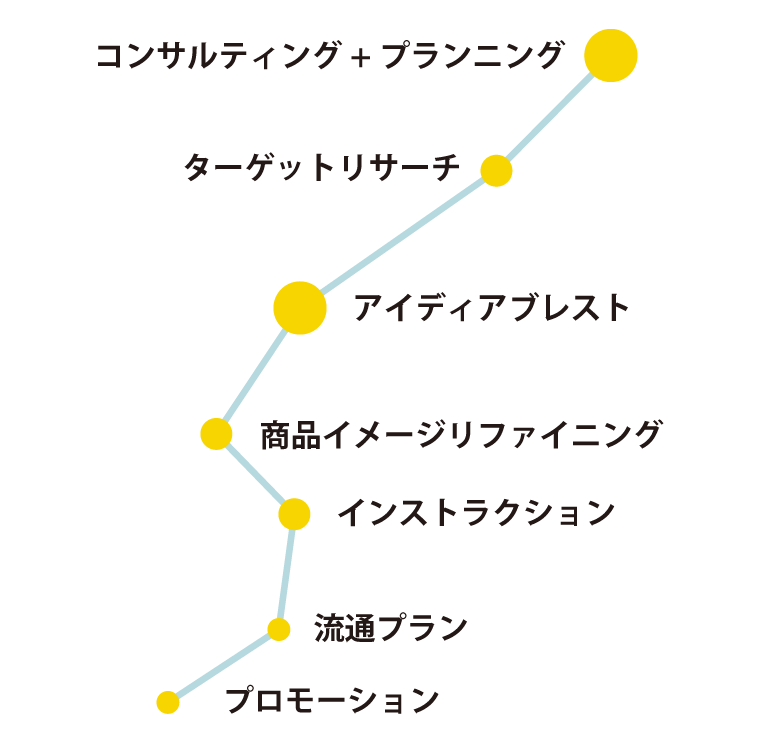 企画理念、コンセプト、ターゲットリサーチなどをベースにし、最適と思われる商品のプランニングからアイディア出しをお手伝いすることが可能です。
